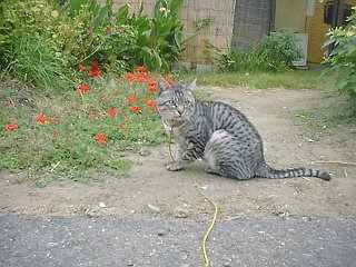 ’00/10/20 今朝は結構寒かった、寒いとマイケルの散歩時間が短くなる マイケルも寒い中散歩するのは、あまり好きでないみたいだ、何故かほっとする・・・。 「赤い花とマイケル」
