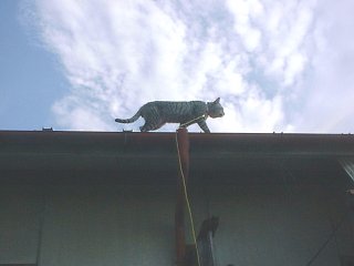 '00/11/15 散歩の途中で屋根の上に・・・、早く降りてこ〜い。