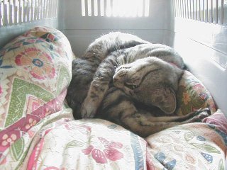 01/4/19 今朝はゲージの中で寝ていたマイケル、すっかりお気に入りの場所に・・・(^^)