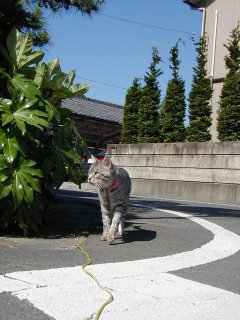 ’01/5/28 今朝は天気が良いので少し遠くに来たマイケル、 この先に保育園があるので、朝は子供を送ってくる親の車が 沢山通る、車が嫌いマイケルはゆっくり散歩出来ない(^^)。 「さて帰るか」
